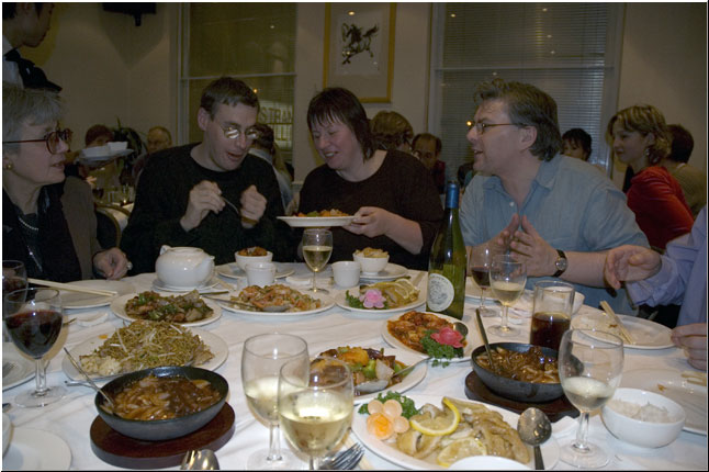 London 6 november 2004; "A Shostakovich Study Day" Diner; Richard Muirden, Daria Wieczorek, John Riley photo: Henny van der Groep